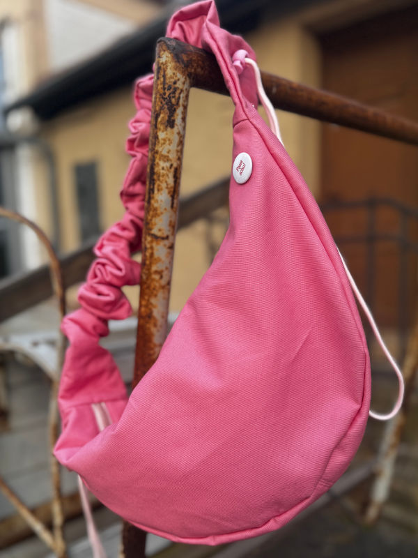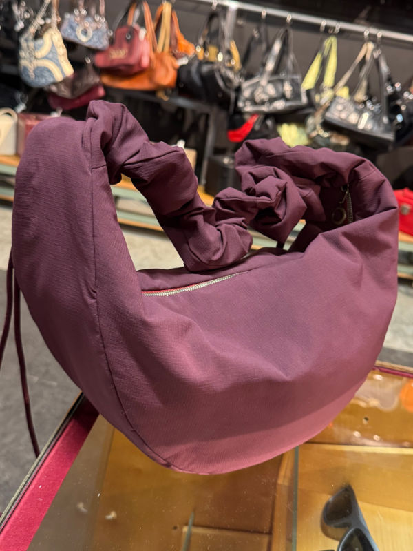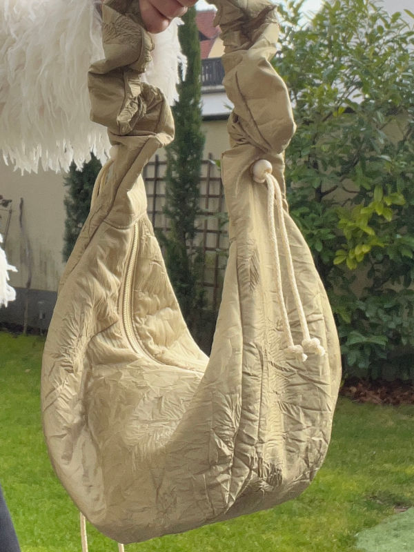 Charakteristisches Merkmal ist der geraffte Henkel mit integrierter Kordel und Kordelstopper. Damit lässt sich die Tragelänge stufenlos einstellen – funktional und zugleich ein bewusst gesetztes Designelement.